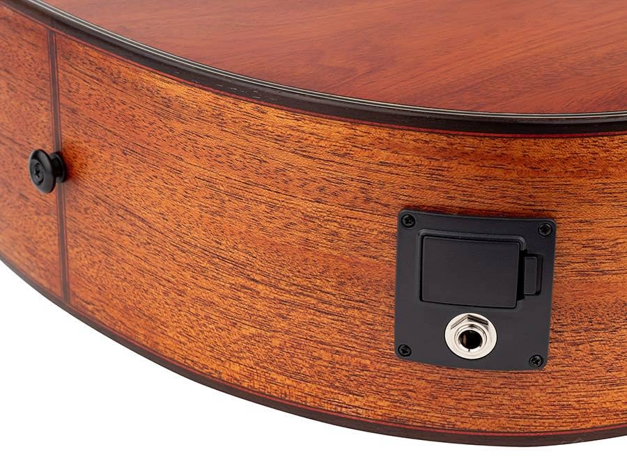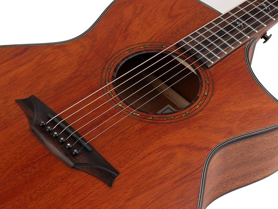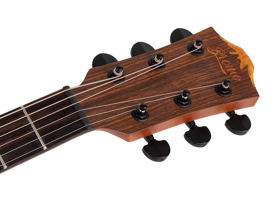 Einzelheiten: Die Bromo BAT4MCE ist eine vollmassive Auditorium Westerngitarre mit Mahagonidecke, Tonabnehmer & Cutaway – warm, kraftvoll & stilvoll – inkl. gepolstertem Case für sicheren Transport